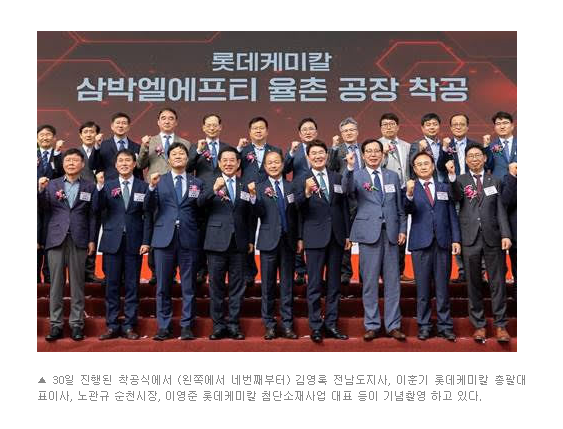 광양만권경제자유구역청(청장 송상락, 이하 광양경제청)은 4월 30일 롯데케미칼의 기능성 첨단소재를 생산하는 자회사인 삼박엘에프티(삼박LFT)가 전남 광양만권 율촌1산단 내에 신규 컴파운딩 공장 착공식을 개최했다고 밝혔다.